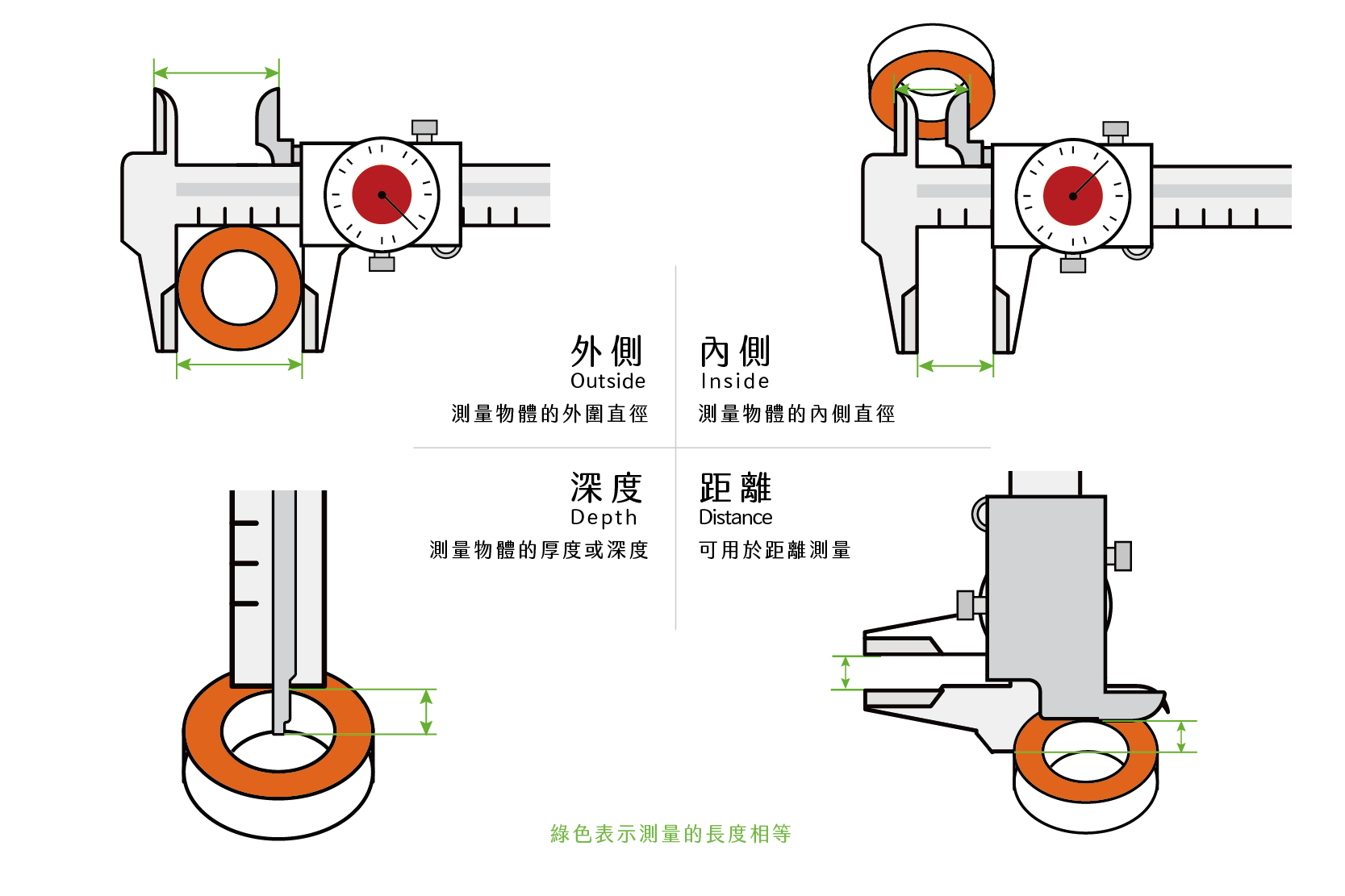 - 最後,將主尺刻度上的數字和附表指針指示之數字相加,即得出總測量值。